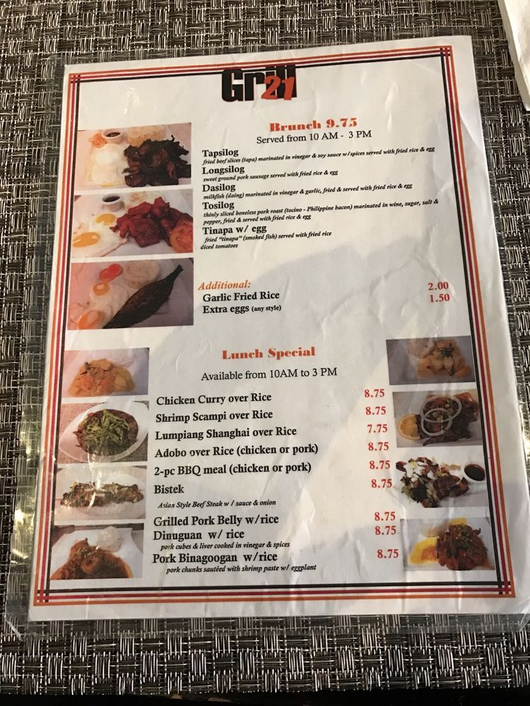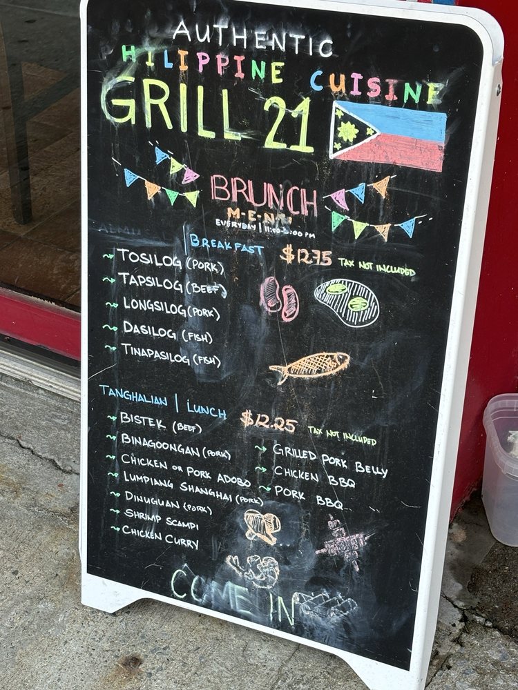 Grill 21, a Filipino restaurant located in New York City, offers a cozy and authentic dining experience. Known for their classic Filipino dishes, such as BBQ skewers, chicken adobo, sisig, and halo halo, this restaurant has garnered positive reviews for its delicious and well-seasoned meals. Customers praise the tender pork collar BBQ skewers and the flavorful chicken adobo, with some mentioning the generous portions and friendly service. The menu also includes daily lunch specials and options for catering. Overall, Grill 21 provides a taste of home with its comforting and mouthwatering Filipino cuisine, making it a must-visit spot for Filipino food enthusiasts in the area.